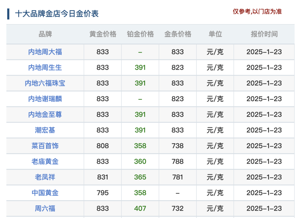 AH黄金股在1月22日也全线大涨。不仅如此,国内零售端品牌足金饰品的价格同样水涨船高,不少品牌金店足金饰品的报价已突破833元/克。